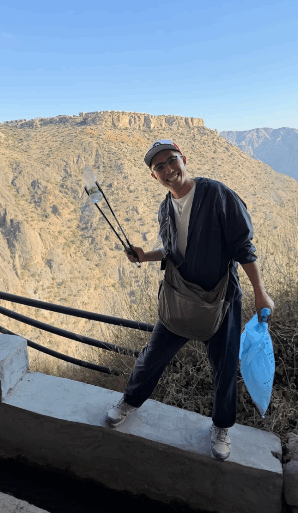 一歩向こうは崖の下、みたいなところを、このオマーンのツアーはお客さんを連れて行きます。ガイドのムアッドさんによると、怖すぎて泣いてしまうお客さんもいるとかいないとか(苦笑)。私も、高所恐怖症なのでまあまあ怖かったですが、命をかけてゴミ拾いしてきました♪