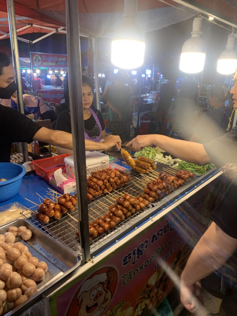 同行した社長さん二人が、ナイトマーケットで、においに釣られて、ソーセージを購入。