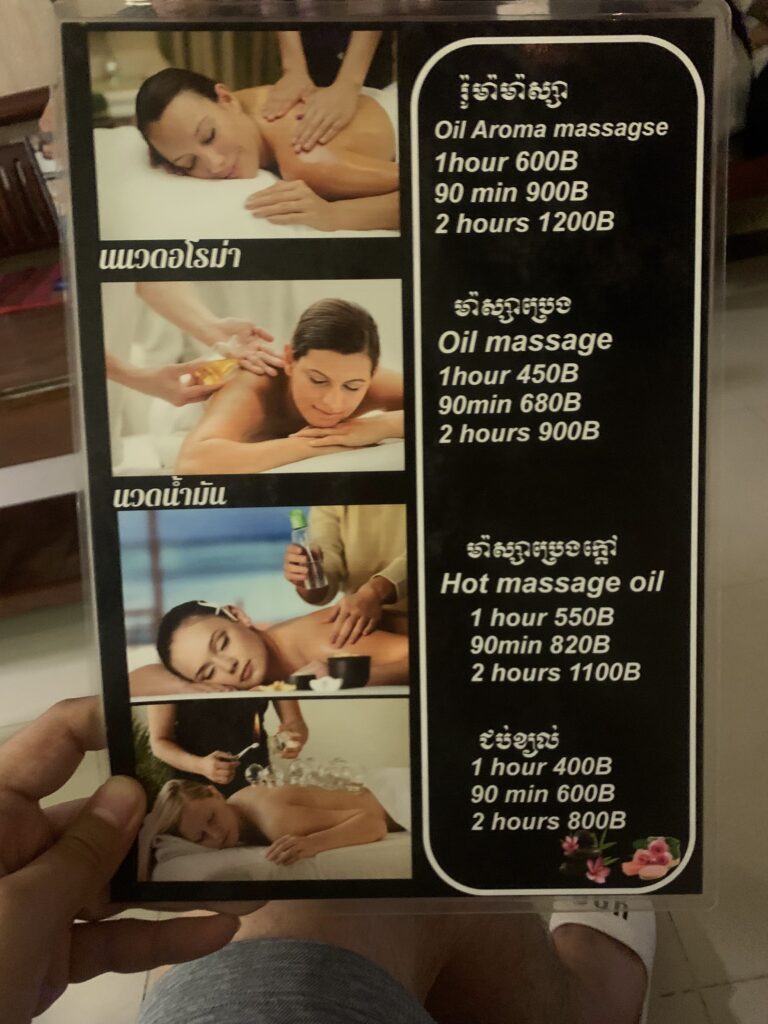 一日、町を歩いたのでくたくた。ということで、最後はマッサージ♪びっくりは、カンボジアなのに、支払いはバーツ!さすが国境ですね。オイルマッサージは1時間600バーツなので、ばくっと2500円。カンボジアでは、なかなかのお高級な値段です。
