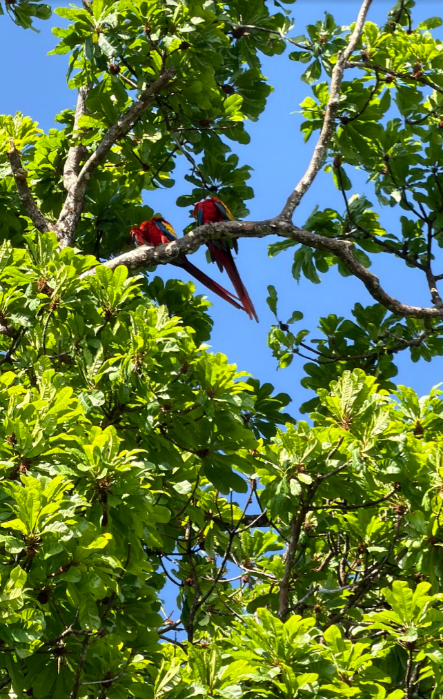 この木の上に、日本では見たことのないような、たくさんの鳥や猿がやって来ます♪ この日は、でっかいオウムが見えました。スカーレットマコーという鳥のようです。