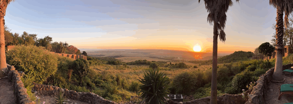 サバンナを見下ろすロッジの朝日です♪ ライオンキングの世界♪