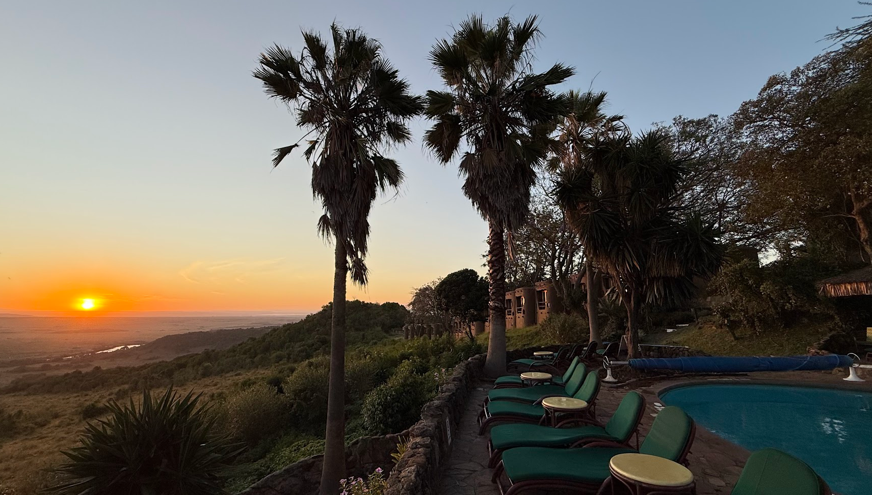 サバンナを見下ろすロッジの朝日です♪ ライオンキングの世界♪