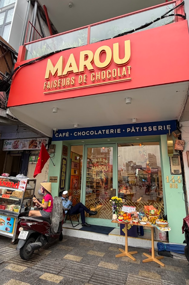 ホテルに朝はやく到着できたので、ホテルに荷物を置いて、近所を早速歩いてみました♪ ベトナムで有名なチョコレートブランド、MAROU。スマホをいじっている警備員が入り口に座ってます(笑)。このお店の前を四回くらい通りましたが、この警備員さん、ずーっと、スマホをいじって座っていました(笑)。日本と違って緩いところがまた素適ですね♪ 日本の警備員なら、あり得ない風景です。