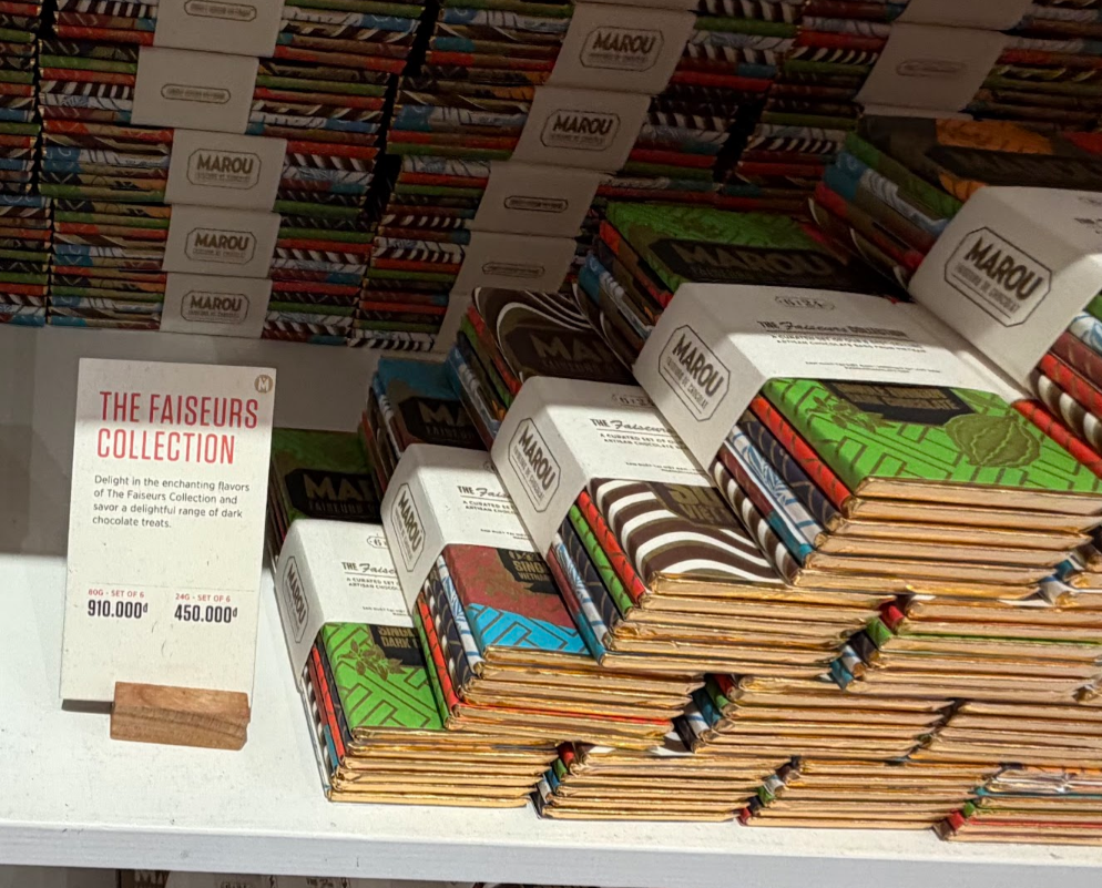 板チョコ6枚セットで3000円。ベトナムにしては、超高価格です。試食をしましたが、普通に美味しい(笑)。でも、「MAROU」という包装紙がなければ、どこのチョコレートかわかりません。中身だけで、「ここのだ!」とわかるのがホンモノ商品ですが、チョコレートくらい多種多様なブランドがあると、それは激難。結局、包装紙勝負になってしまいます・・・。