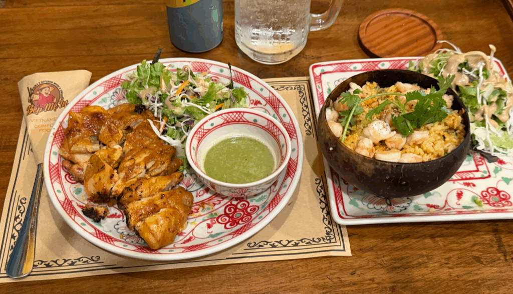 お昼ご飯♪ 鶏肉の照り焼きと、ココナッツチャーハン。Googleマップのクチコミが1万を超える、ミシュランのお店ですが、「感動!」というレベルではなかったかも。でも、美味しいです♪