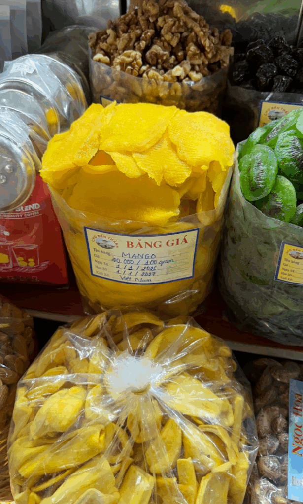 砂糖漬けされていないドライマンゴーがあったので購入♪ 一袋1200円と言われましたが、値切って、3袋買って、1袋600円になりました♪ 50%、割引きしてもらえました♪ この市場では、値札がないので、値切る必要があります。
