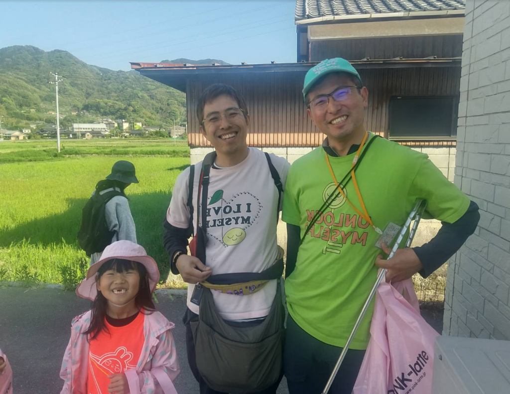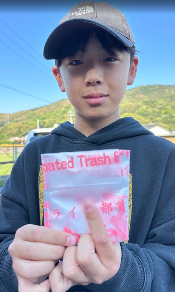 地元の町議の息子さんが、ゴミ拾いに参加してくれて、あんまりイケメンで素適なので、私が折りたたんで持っていたご当地ゴミ袋をプレゼント♪ そしたら、この子の名前が「らいと」くん!あまりの偶然に、町議のお父さんが鳥肌が立つくらいビックリしていました(笑)。こんな「逸話」があると、「ゴミ拾い仙人の吉川充秀はタダモノじゃない」という伝説が創り上げられていきます(笑)。残念ながら、私はタダのモノですが(笑)。