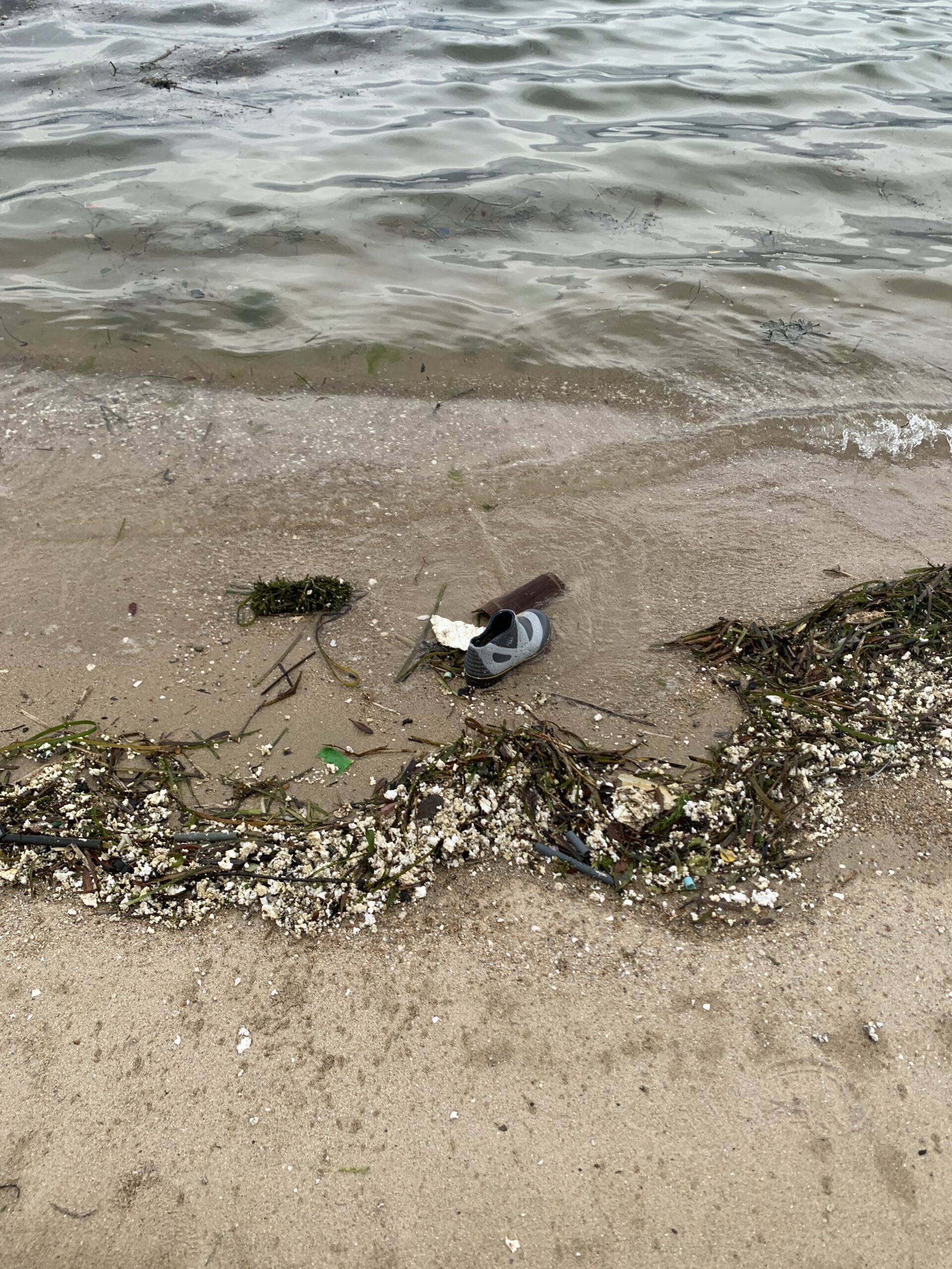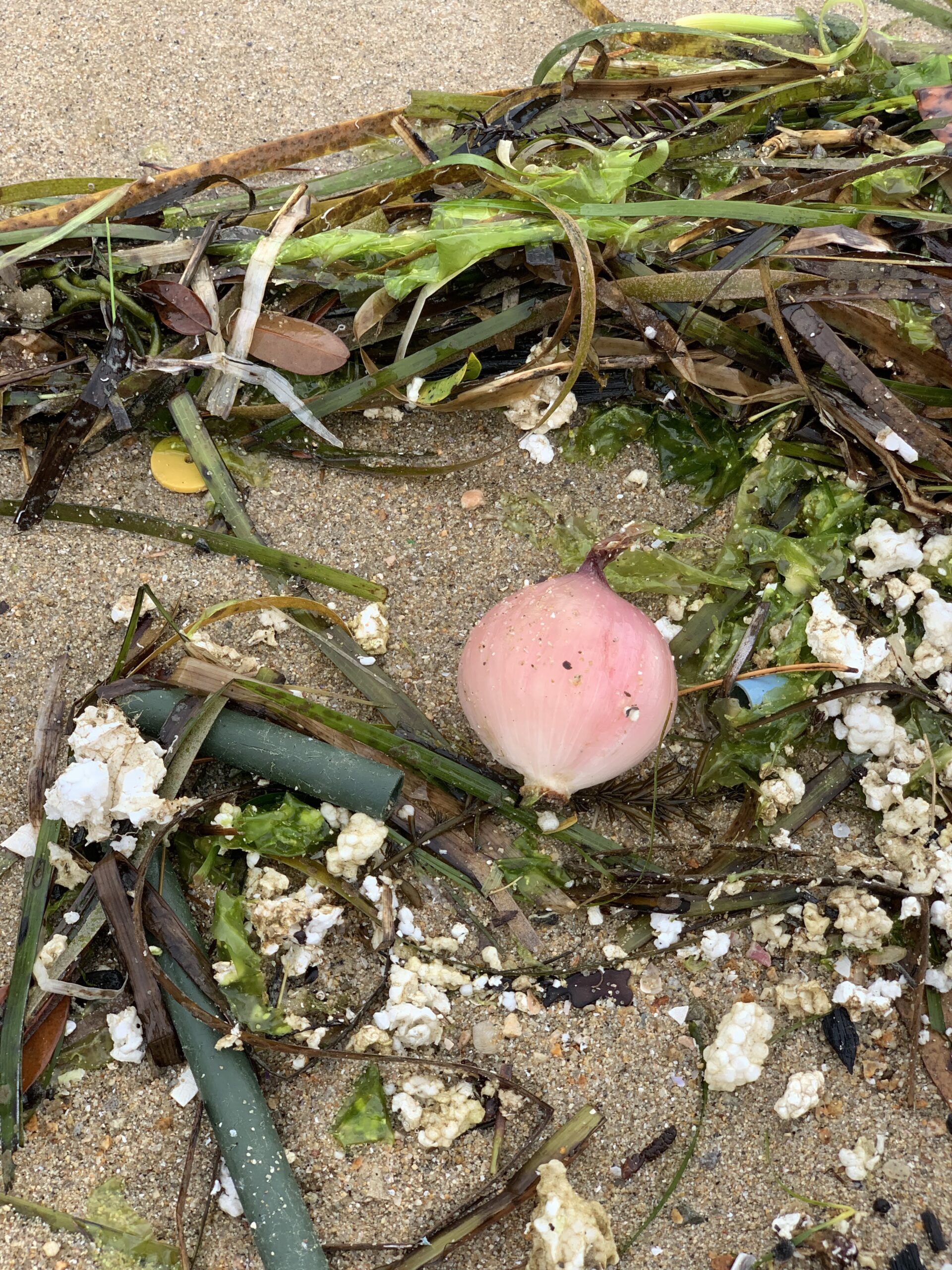なぜかタマネギも落ちていました(笑)ポップコーンのような白いのは全部発泡スチロールの破片です。これが小さく小さくなって、お魚さんがエサと間違えてぱっくんちょしてしまうようです。スポギョミ大会で、学んだことによると、2050年には、プラゴミを食べた魚のほうが、食べてない魚より多くなるとかならないとか。