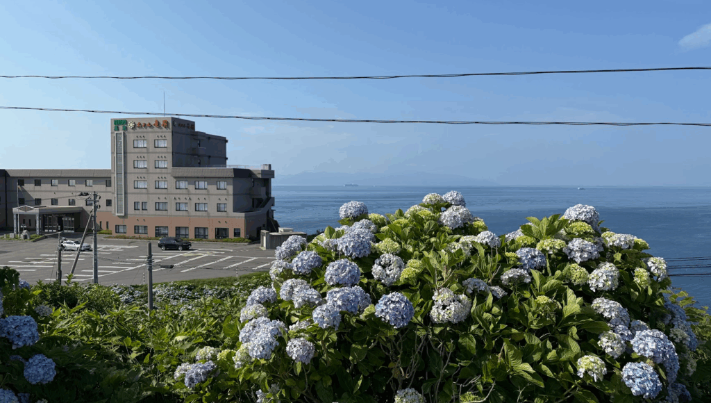 ここから見ると、断崖の上にあるように見えるのが、ホテル竜飛です♪ 向こう側に見えるのは、北海道です♪ 次に青森県に来るときには、こんなホテルに泊まって、夜に満点の星空を眺めるのも素適です♪