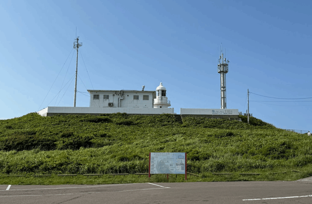 竜飛岬の灯台。もはや、階段国道で力を使い果たし、登る気力も体力も時間もないので、写真だけ撮影して撤収です(笑)。