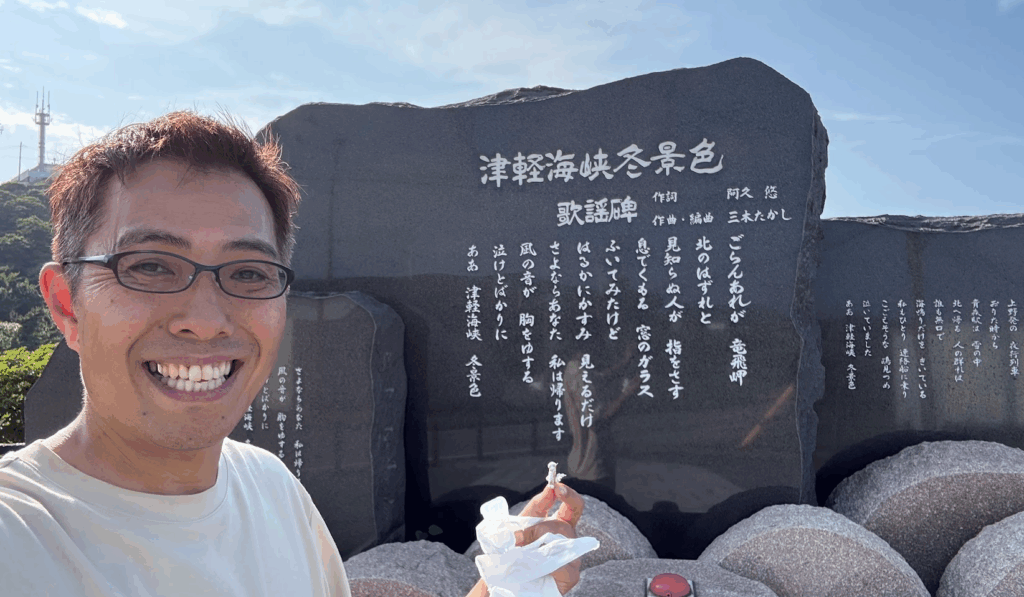 そして、竜飛岬の名所が、津軽海峡冬景色の歌碑。赤いボタンを流すと、津軽海峡冬景色の二番が流れます♪