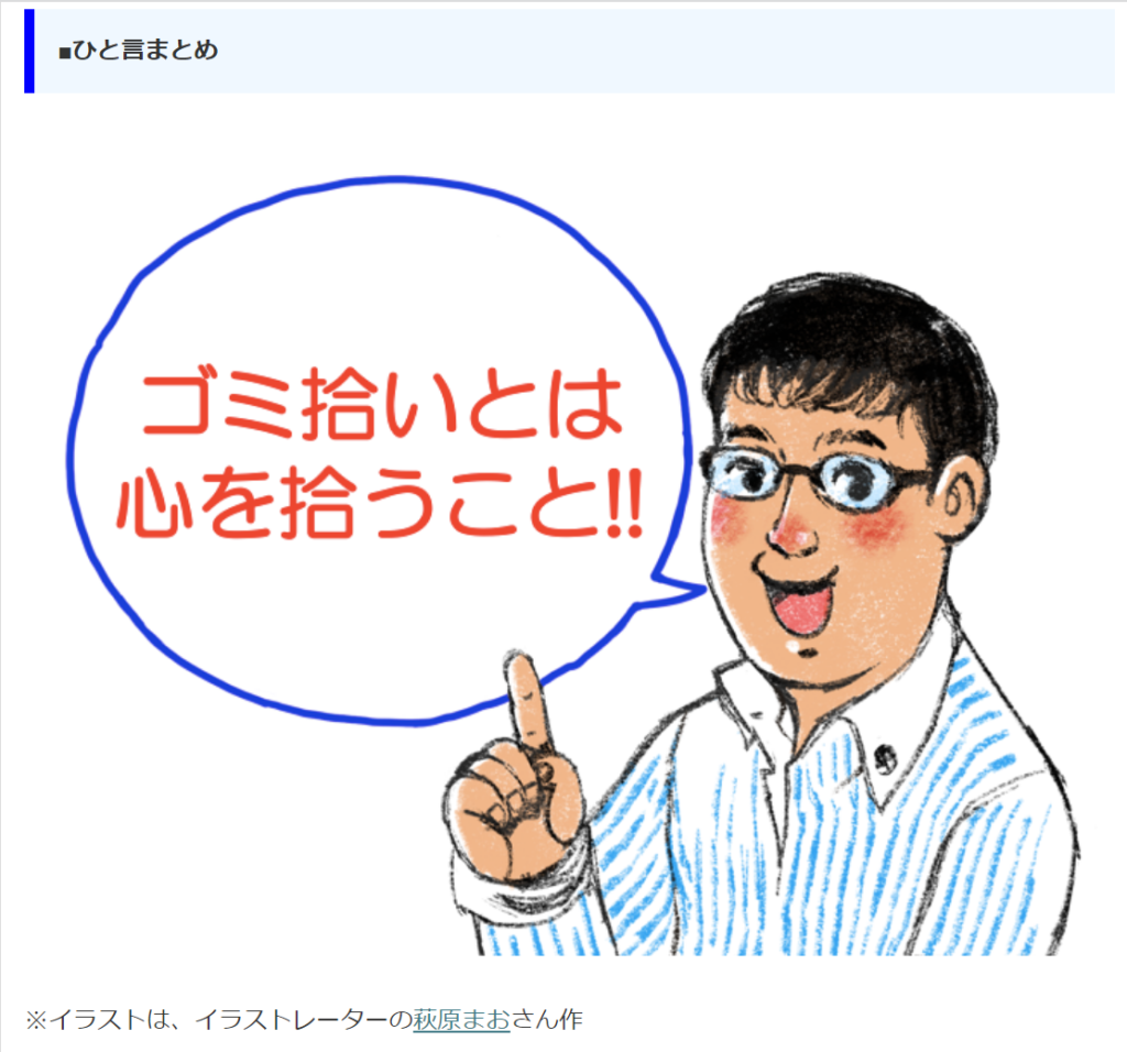 ライフワークはゴミ拾いであり、これまで国内外で拾ったゴミは100万個超。地元では「ゴミ拾い仙人」として知られ、市長のブログにも登場するほど。このゴミ拾いこそが、自身の成功の最大要因であり、ゴミ拾いの魔法の伝道師として、現在、全国で講演活動を行っている。