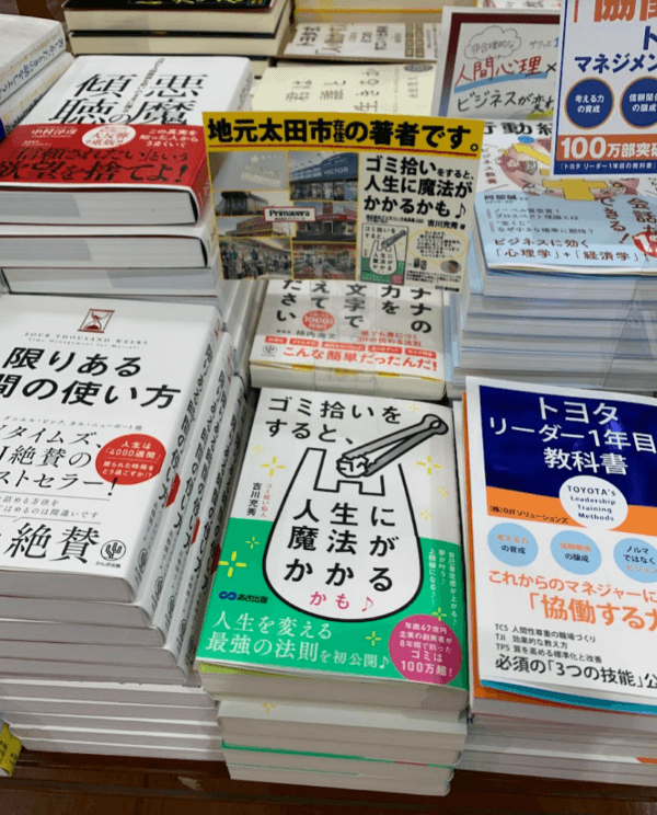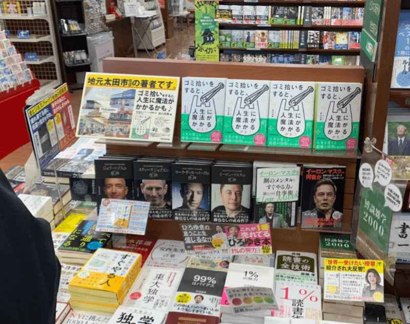 そして、隣の棚に目をやると、さらに四面展開で、ポップを拡大して陳列してくださってます♪ゴミ拾い仙人の吉川充秀が、イーロン・マスクさんや、スティーブ・ジョブスさんと一緒に並んでいるところが痛快ですね(笑)