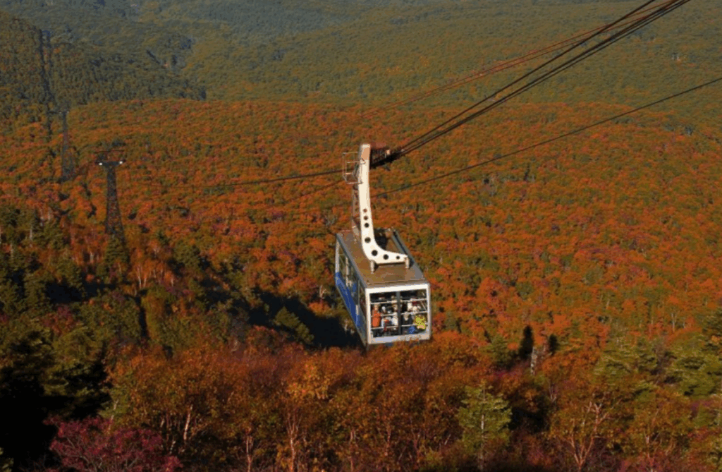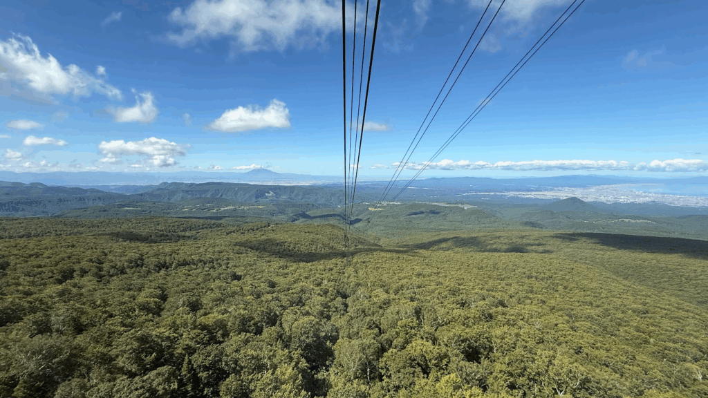 八甲田山ロープウェイからの景色♪ ロープの左側に見えるのが、青森県最高峰の岩木山。右端に見えるのが、青森市と陸奥湾♪ あと20日くらいすると、八甲田の山の木々が、真っ赤に紅葉します♪