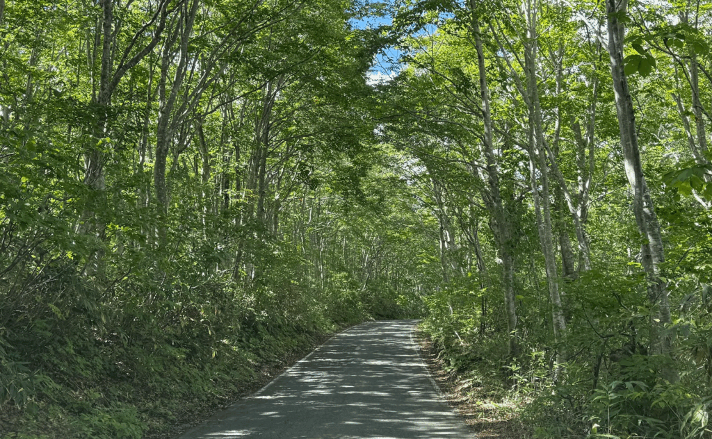 こんなグリーンロードを抜けた先に、日本三大秘湯の一つ、谷地温泉があります♪