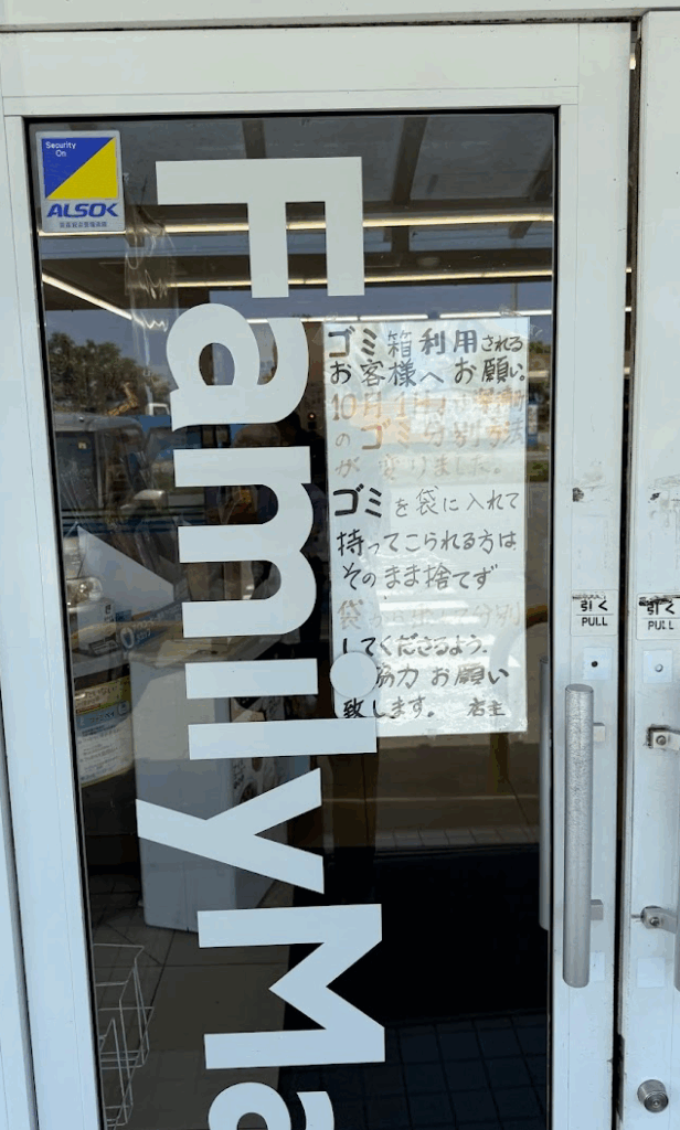 コンビニでのゴミ箱事情も、年々厳しくなってきているように感じます。ここでは、袋ごと捨ててはだめ、分別を促していました。