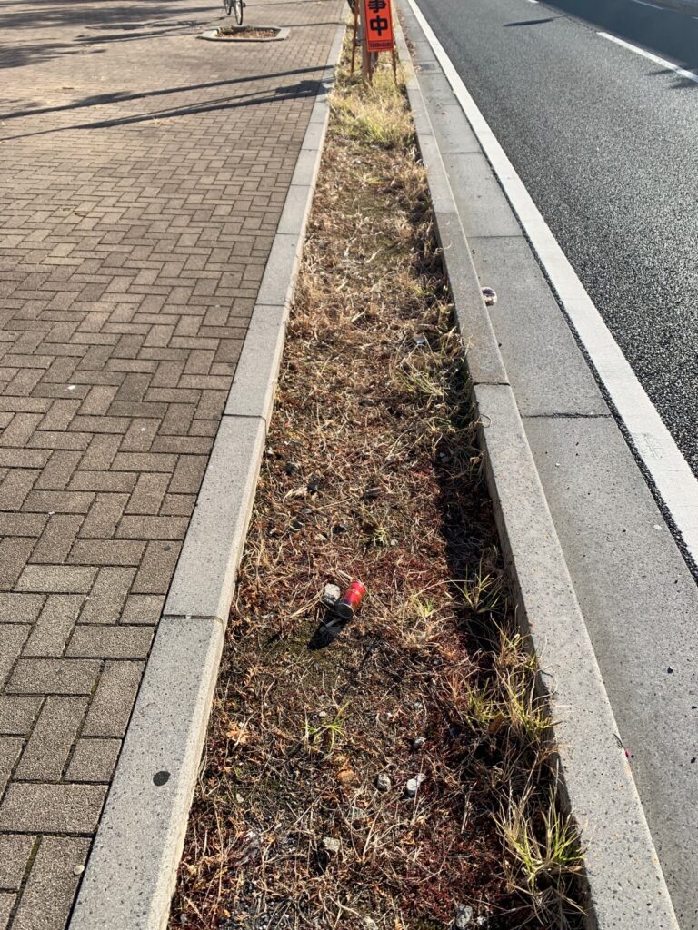 さて、この日のゴミ拾い。道路は比較的きれい、と思っていたら、風が強い日ほど、ゴミは吹きだまりにたまります。この日は、街路樹の植え込みにたくさん。