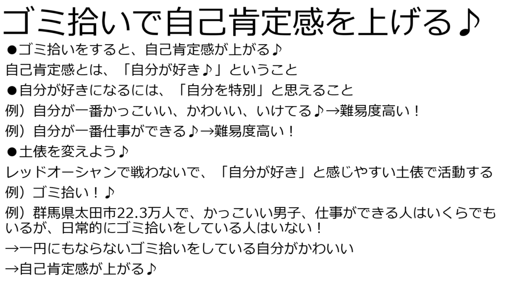 ゴミ拾いをすると、上機嫌になるということを、自己肯定感などを使って、説明いたしました♪