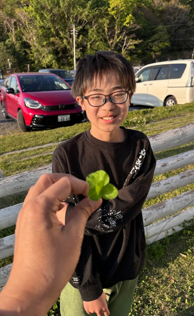 優しい、笠原颯愛くんが、私のために、五つ葉のクローバーを見つけてプレゼントしてくれました♪ 将来の「掃除大臣候補」から、私に幸福の賄賂ですね(笑)。