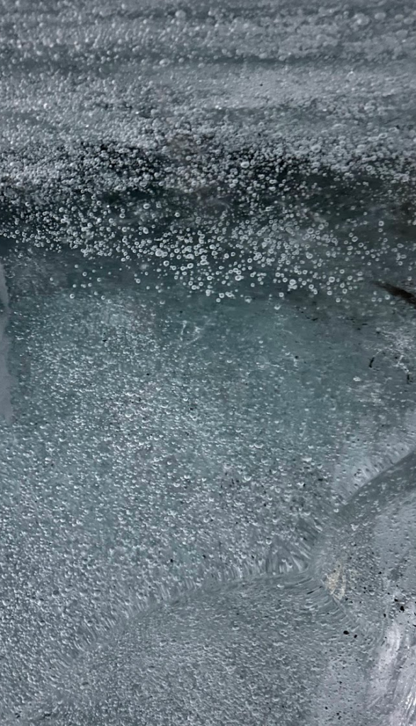 氷河をアップで撮影すると、気泡がたくさん入っています。この気泡が少ないほど、古い氷河なんだそうです。