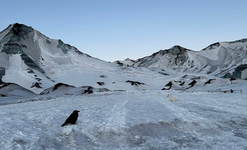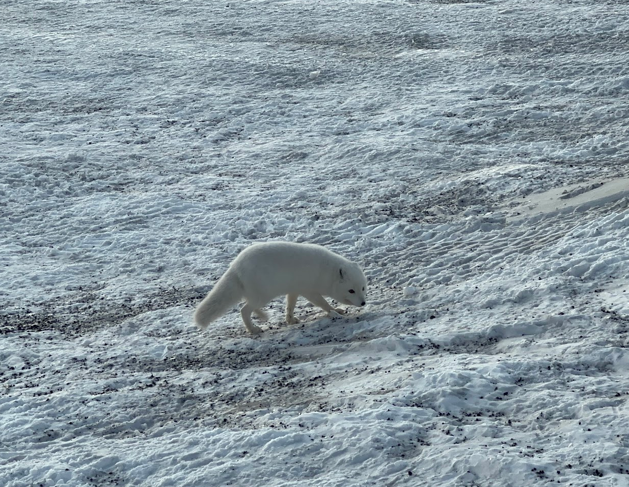 帰り際、奇跡的に北極ギツネに会いました♪ 現地ガイドさんが、「運がよければ、見られるかもしれませんが、用心深いので、なかなか見ることはできません」と言っていた北極ギツネが、エサを求めて、ひとなつっこくやって来ました♪