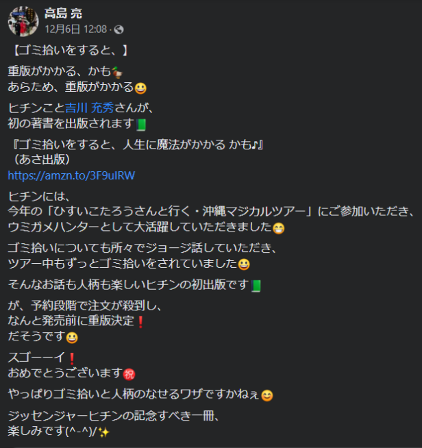 嬉しいことに、FACEBOOKで、何人かの皆様が「ゴミ拾いをすると、人生に魔法がかかるかも♪」の著書を紹介してくださっています♪
