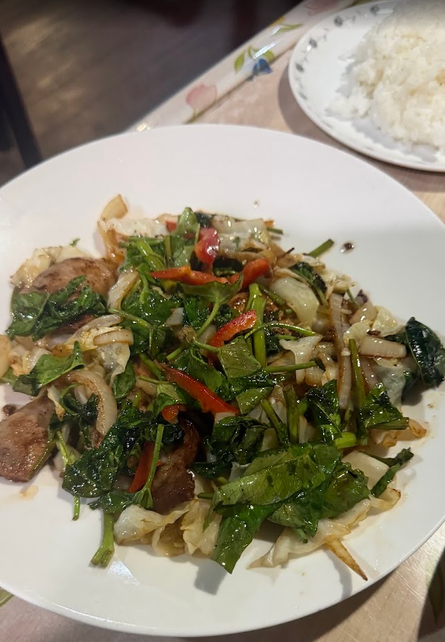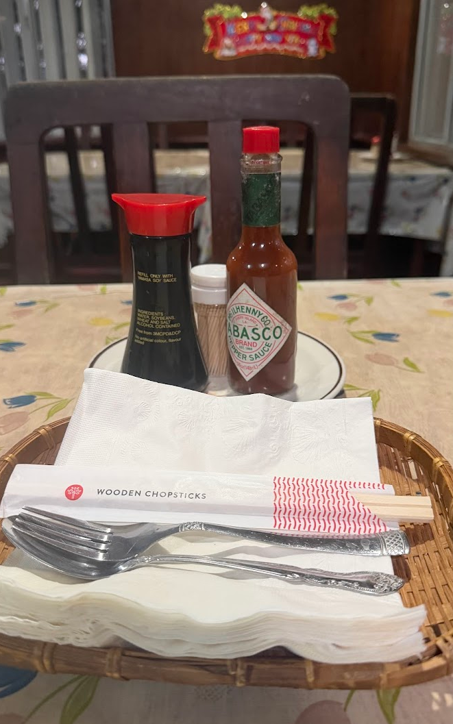 店内に入ると、ノーBGM・・・。「来る店間違えたかな?」と一瞬思いましたが、店員さんを呼んで注文。餃子と、豚肉野菜炒めと白米とマンゴージュース。醤油味で美味でした♪ 野菜は空心菜とのこと。調味料が、醤油とタバスコという二択で面白いですね♪