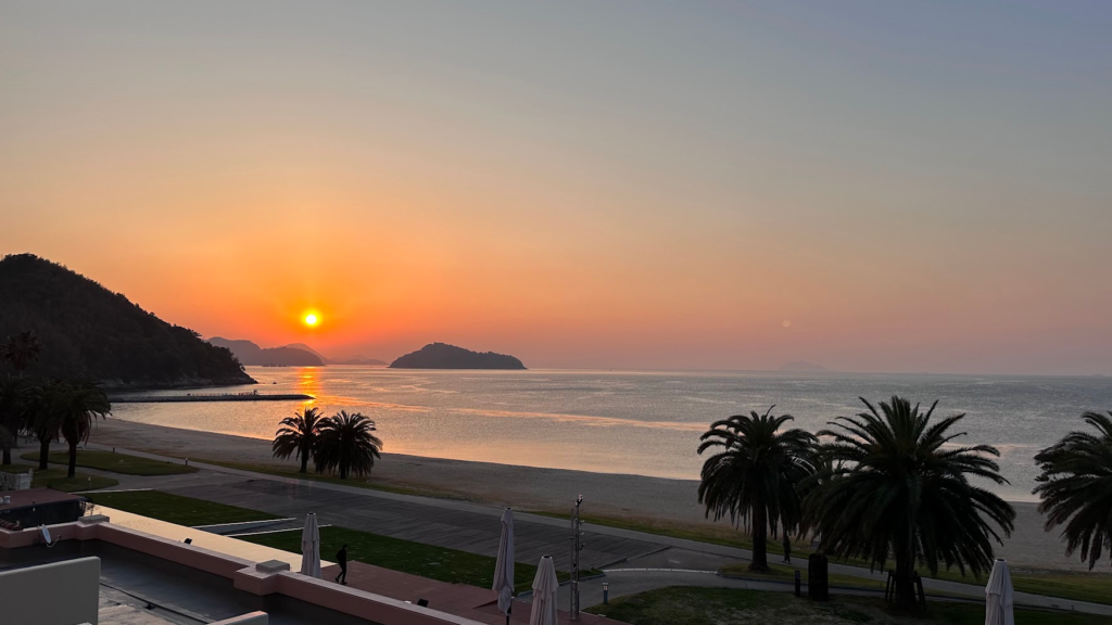 周防大島町のホテルのスイートルームからの朝日♪ 美しすぎて言葉にならない風景です♪ まさに「時が止まった」感があります♪