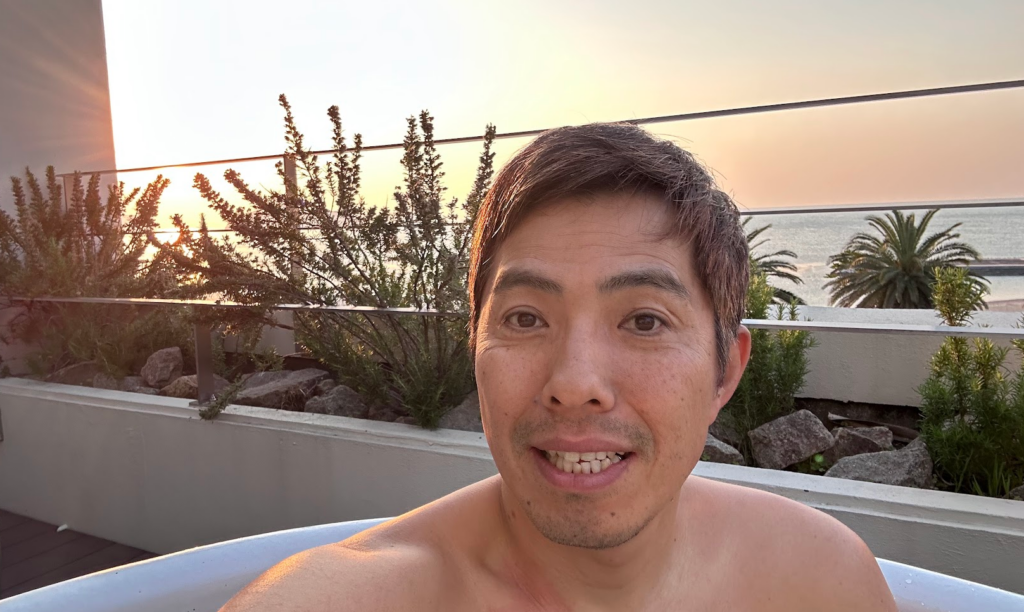 朝からぜいたくに、お部屋についている露天風呂♪♪ 朝日を浴びながら優雅なひととき♪ オーストラリアでは、湯船に浸かれなかったので、お風呂が恋しかった(笑)。