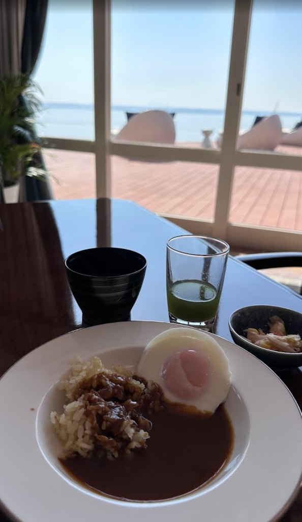 オーシャンビューで、周防大島みかんカレー朝食♪ ちなみに、ご飯も「みかんご飯」です。大好きな卵をトッピングしたら最高でした♪