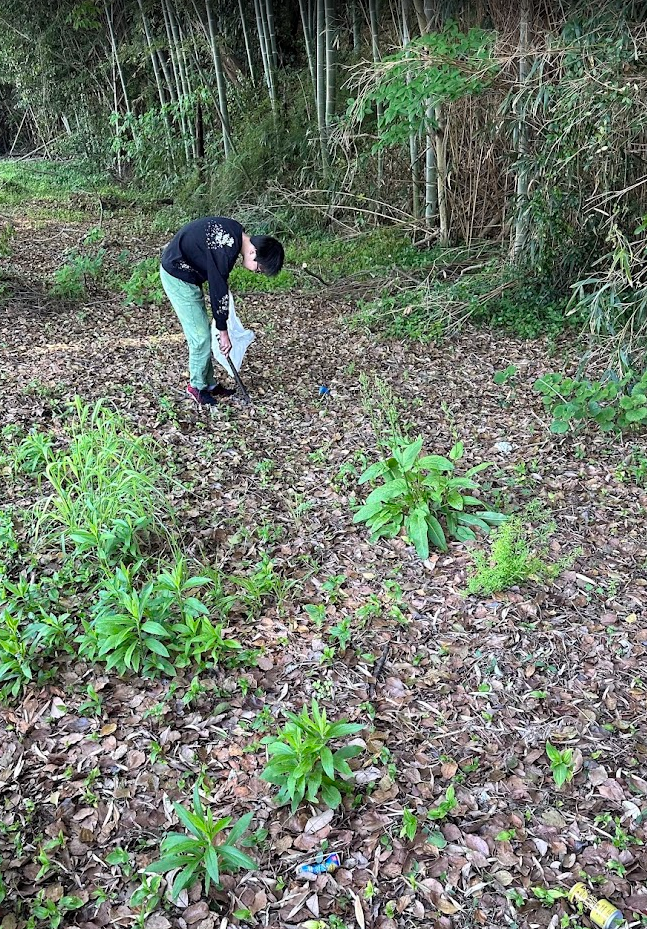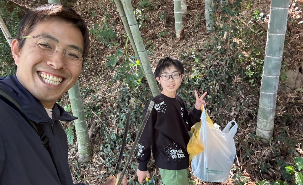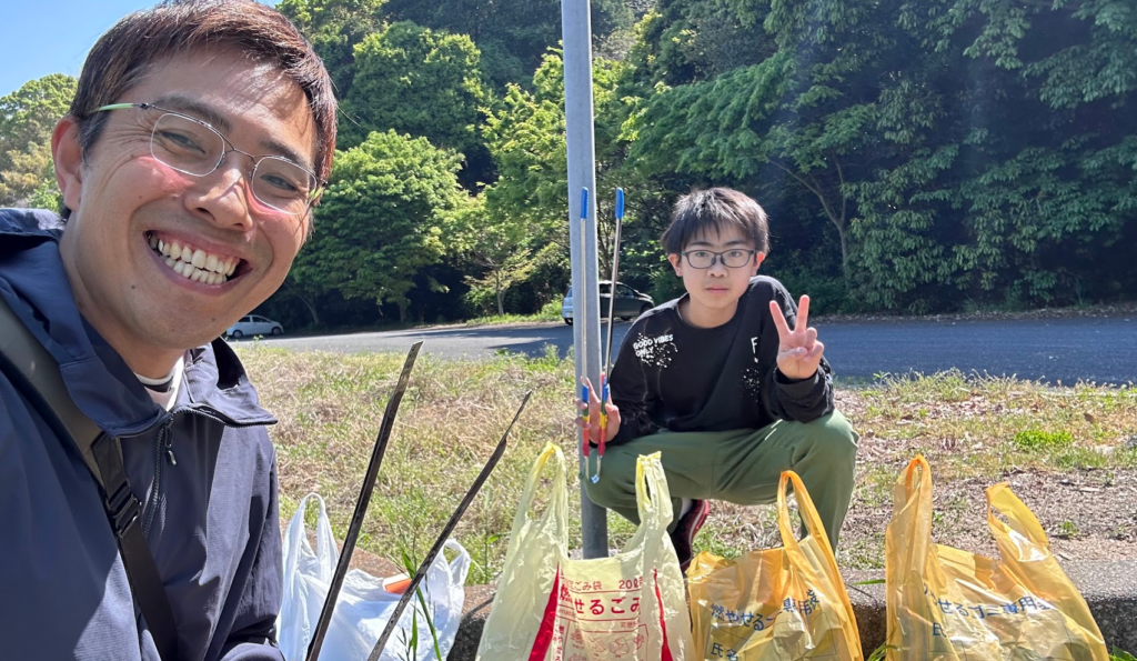 ゴミ拾いに夢中の颯愛くんを振り向かせて記念写真♪ ゴミが多いので、資源ごみとそれ以外の簡易分別をしながらゴミ拾いすることをすすめました♪ その他、ゴミ拾いのテクニックを必要な分だけ、教えました♪