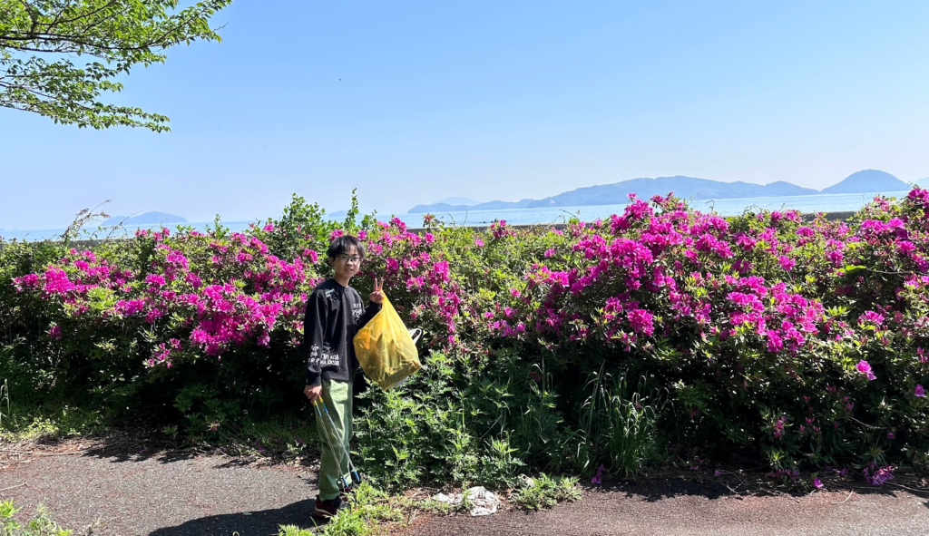 次なるは、国道沿いの、つつじがきれいな駐車場。ここでも、ゴミ拾い♪