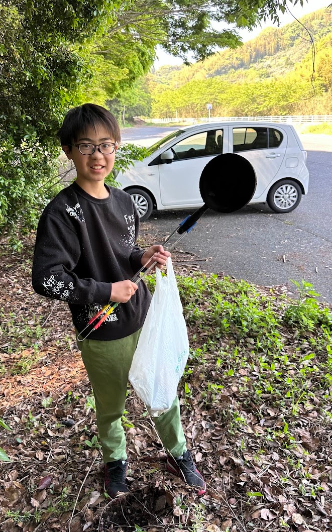 ゴミ拾いに夢中の颯愛くんを振り向かせて記念写真♪ ゴミが多いので、資源ごみとそれ以外の簡易分別をしながらゴミ拾いすることをすすめました♪ その他、ゴミ拾いのテクニックを必要な分だけ、教えました♪