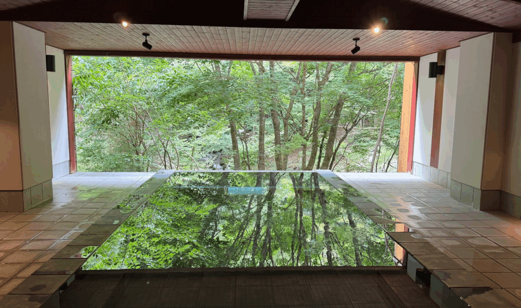 この温泉の名物が、三つあるお風呂の中の「立ち湯」です。この写真は、誰もお客様がいない時間を狙って、パシャリ。お湯に、長野県扉峠の山深い緑がくっきり映っています♪ この湯の一番奥まで行くと、立って浸かる深さの立ち湯です。この立ち湯が素適すぎて、一泊の間で四回も浸かってしまいました♪