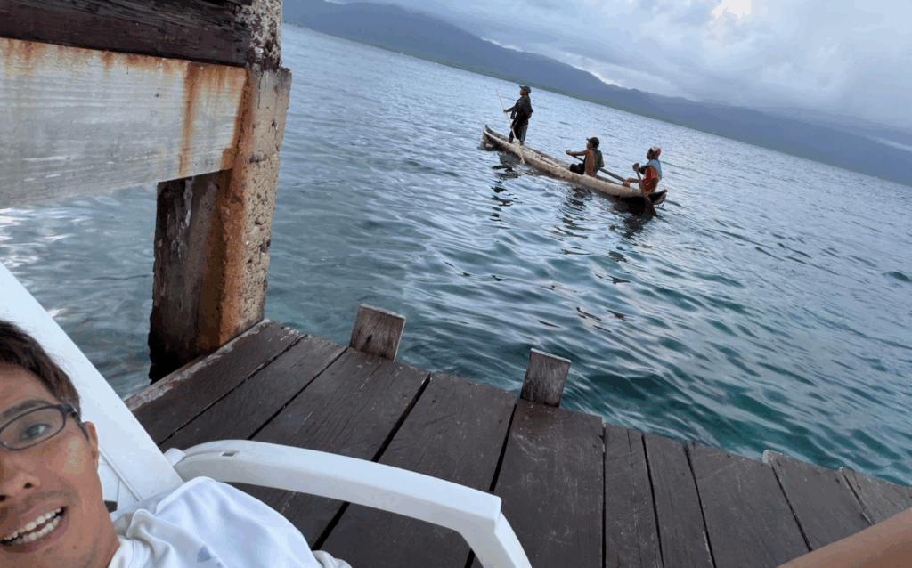 朝、デッキでたたずんでいると、丸太船に乗った男性三人の楽しい話し声が聞こえてきます♪ 牧歌的な平和なシーンで、こちらもほっこりんこしちゃいます♪