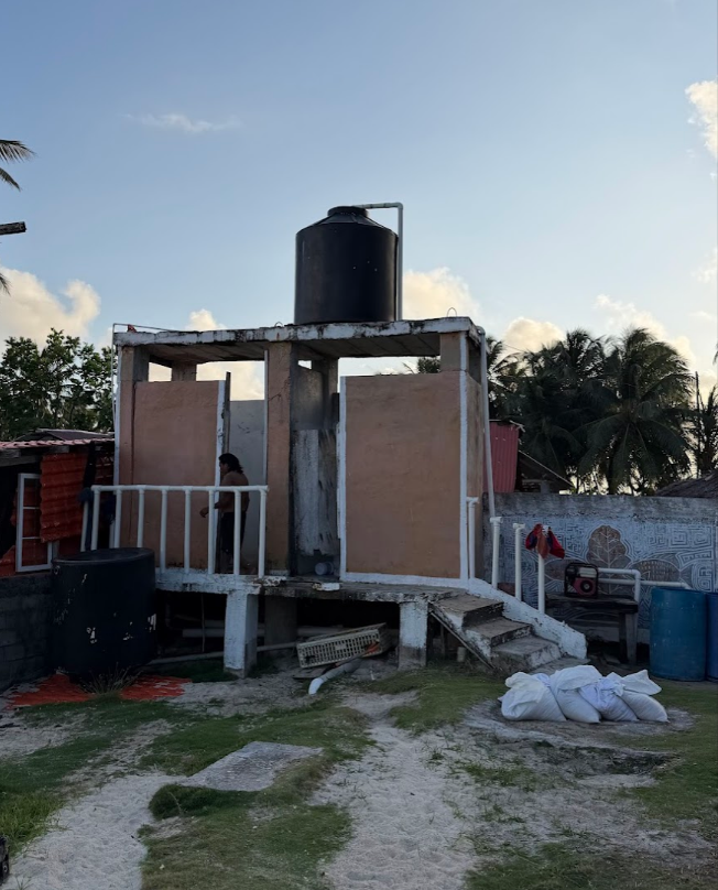 島の水がめ。このタンクの水は、本土にボートで渡って川から採取してくるそうです。この水をポンプでくみ上げて、フィルターを通して、浄化して、シャワーや手洗いの水として使っています。飲料水としては適さないので、飲料水はガロン単位でミネラルウォーターのボトルを買っています。島に水道がないのは、本島でした♪