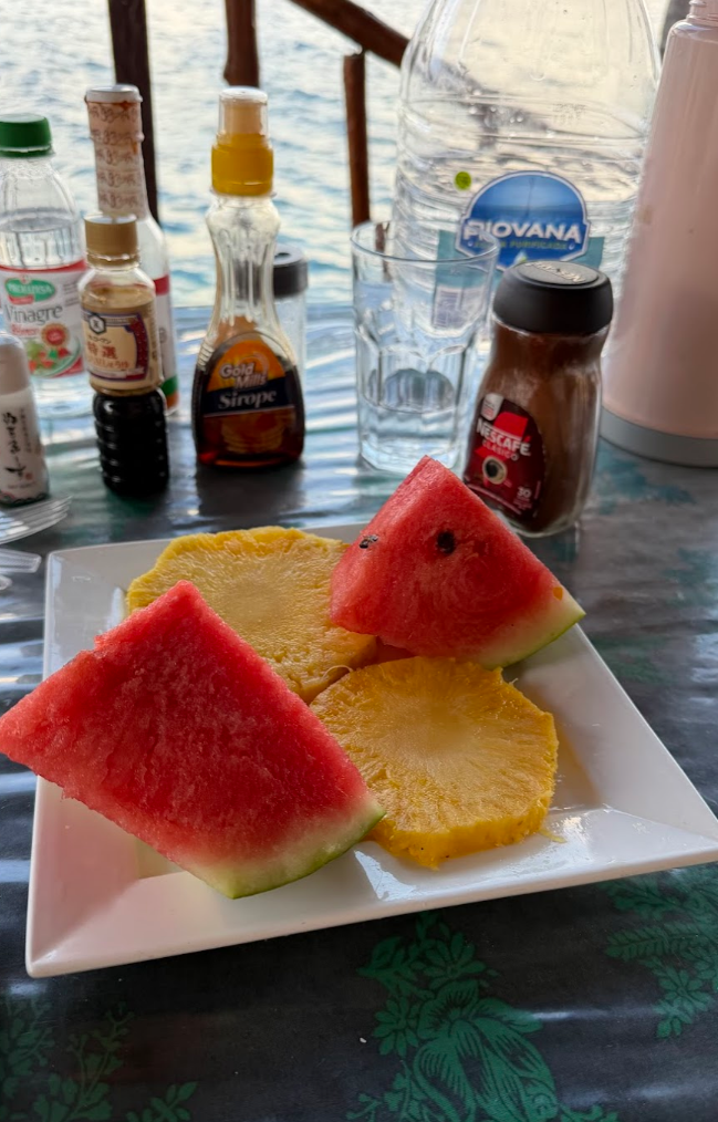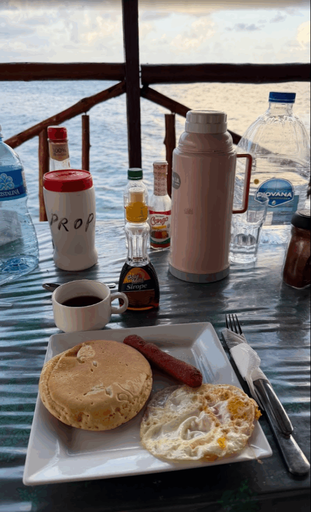 朝ご飯♪ シンプルだけどロケーションが素適♪ そして、卵やソーセージも船でわざわざ本土から取り寄せたと思うと、感謝ひとしおです♪ 余計に美味しく感じます♪