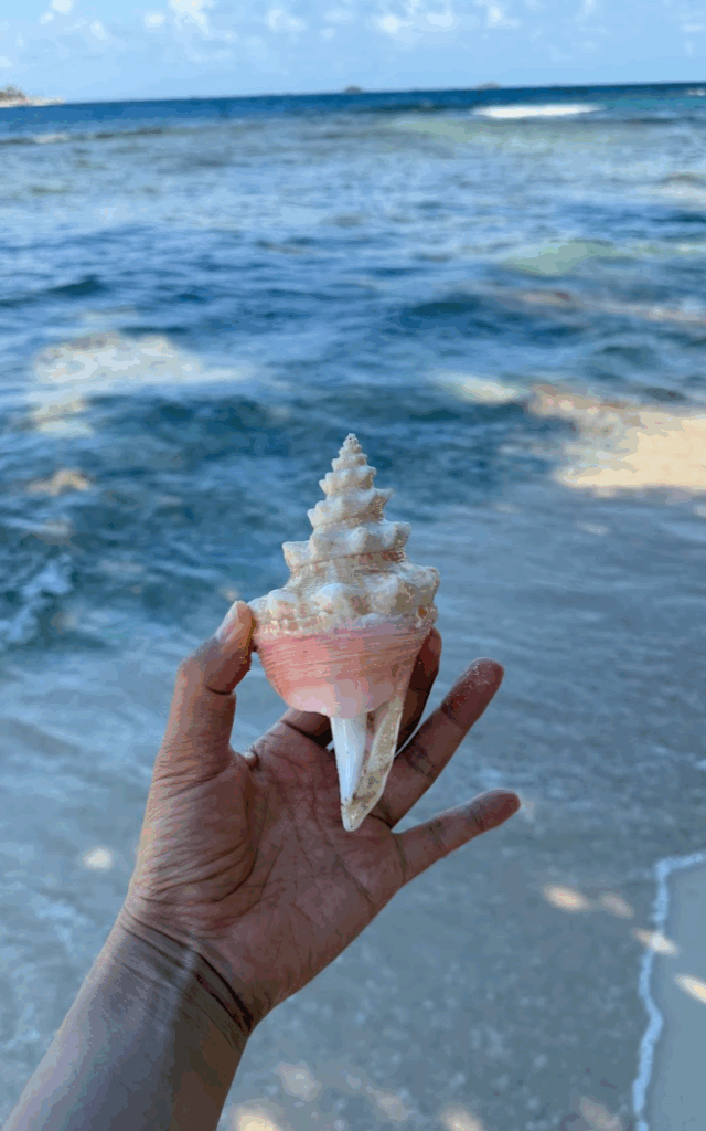 朝食後は、ゴミ拾いのお勤め♪ キレイな貝殻が転がっています♪ こんな大きな貝殻が落ちているのは、いろんなビーチに行きましたが、初めてかも。旅行客人口が極めて少ないからこそですね♪