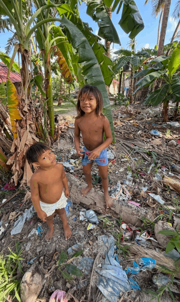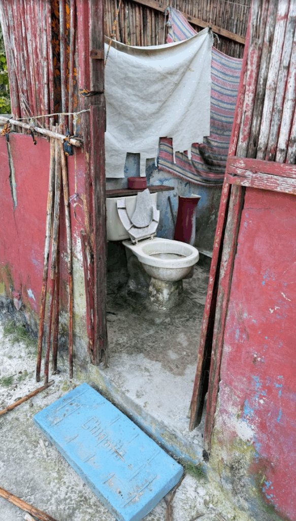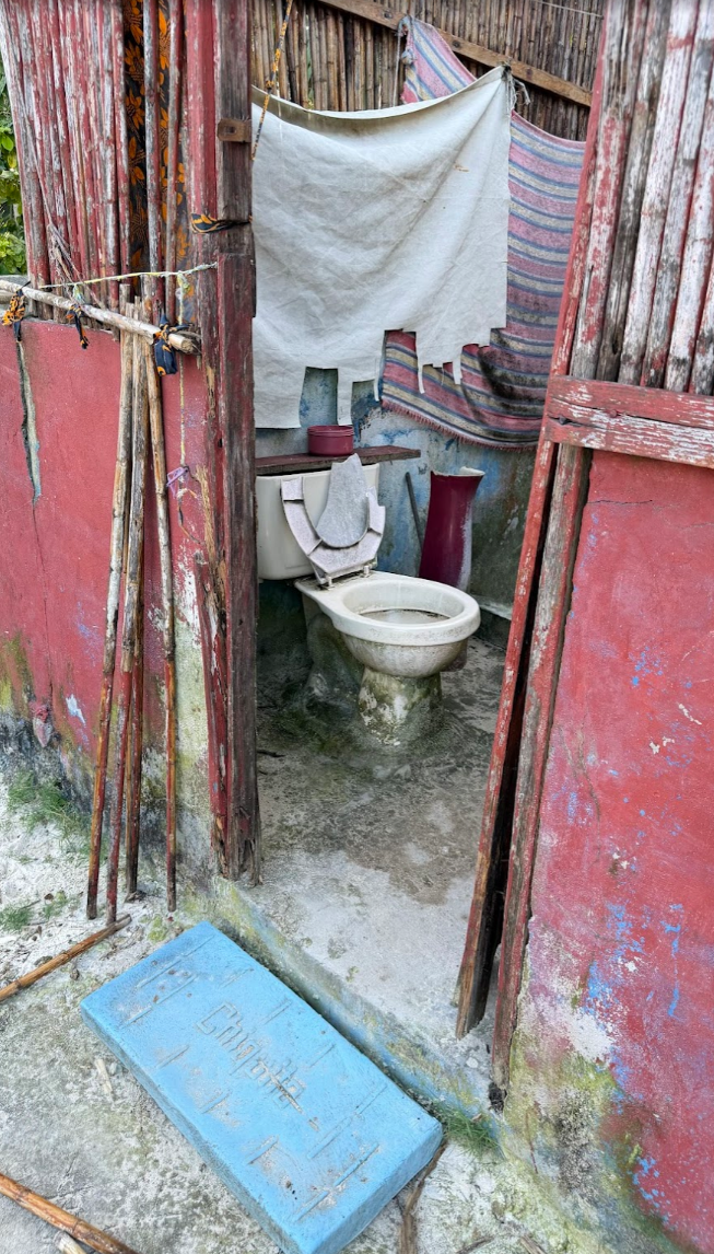 家庭の一軒一軒には、トイレがありません。共同でトイレを使っているようです。が、便器が割れて、トイレがすごいことになってます。ちなみに、一緒にゴミ拾いした男の子は、トイレなど使わずに、私の隣、50センチのところで、いきなり放尿しだしました(笑)。ワイルド(笑)。トイレがこれだけ汚いと、使いたくなくなるかも。こんな汚いトイレをキレイにするのもまた楽しい遊びになりそう。もう3日くらい、この島にいたら、一宿一飯の恩義で、トイレをキレイに掃除したかも(笑)。