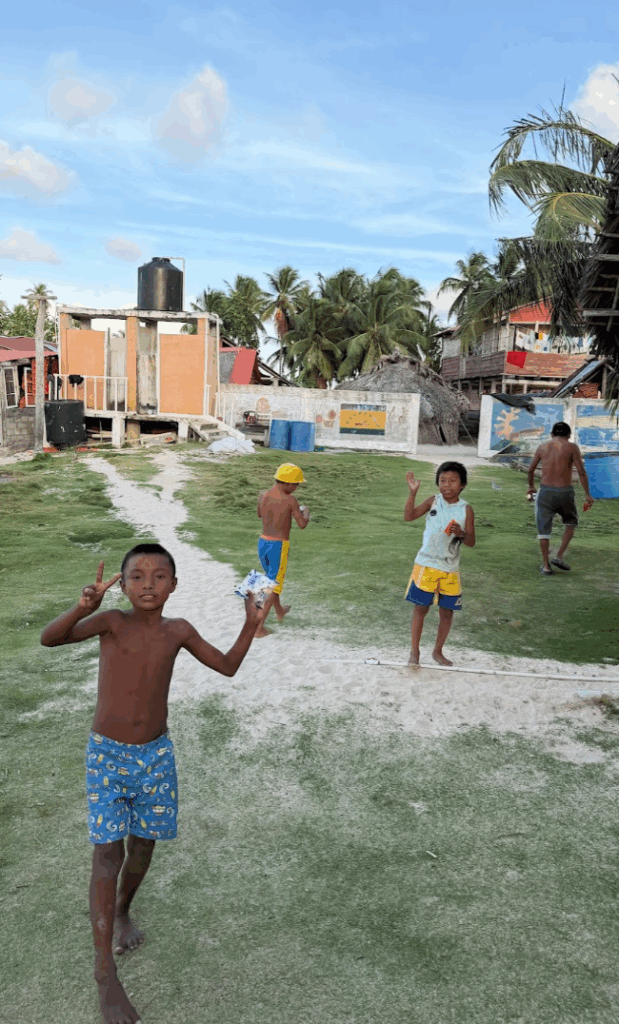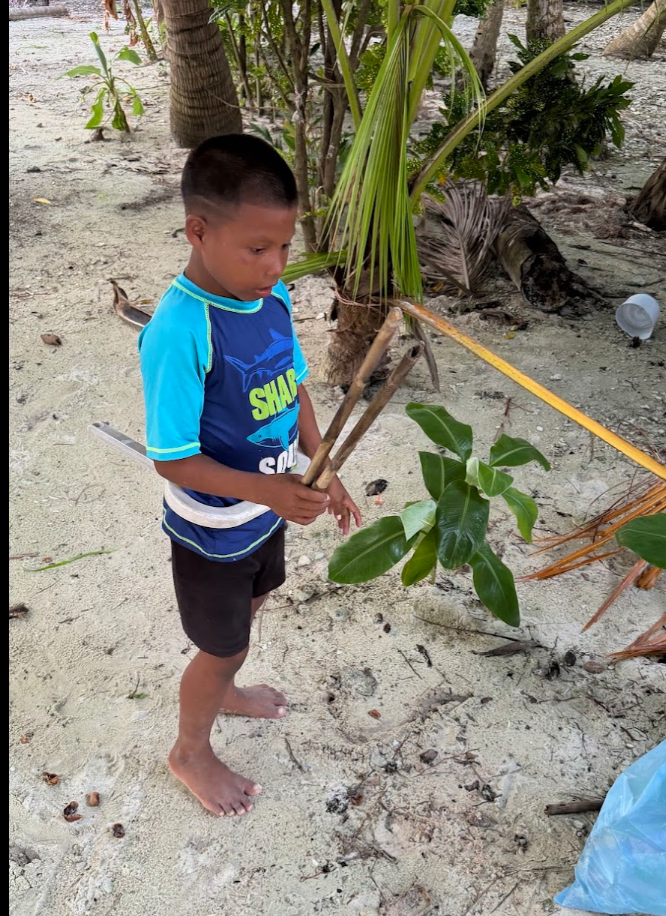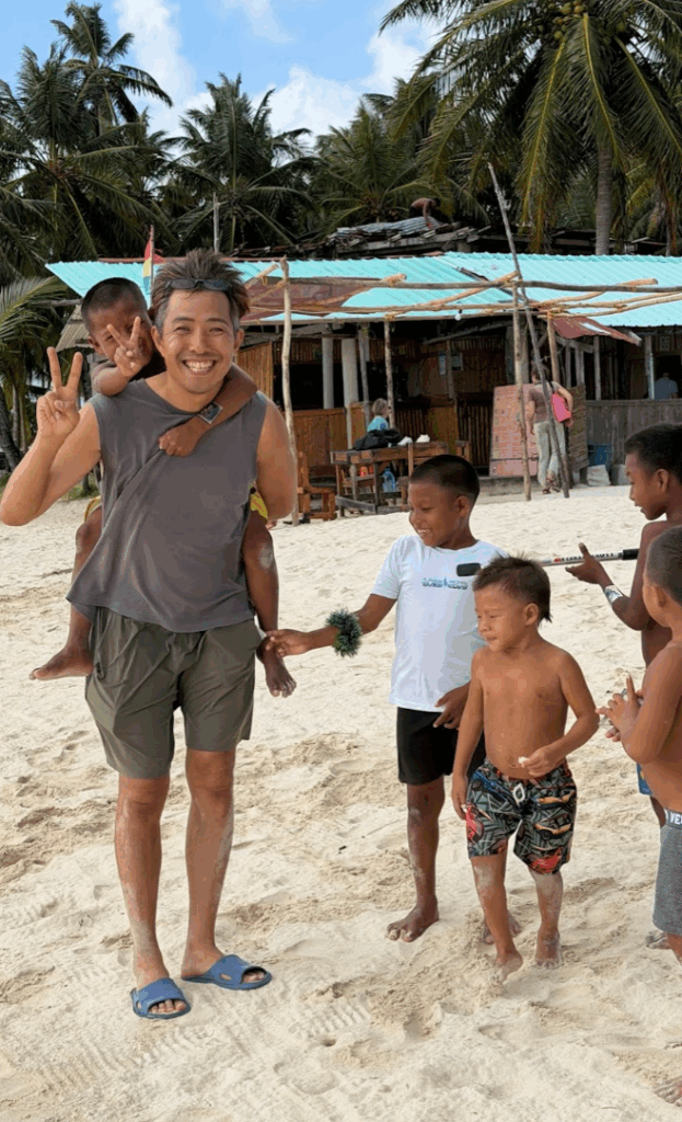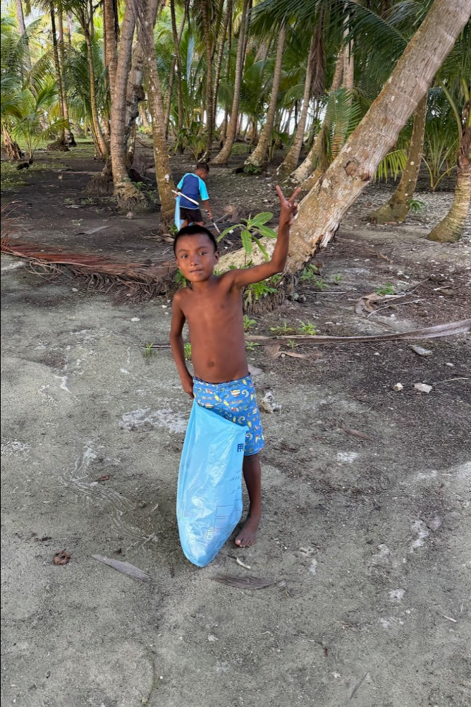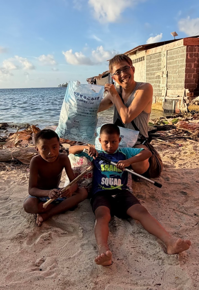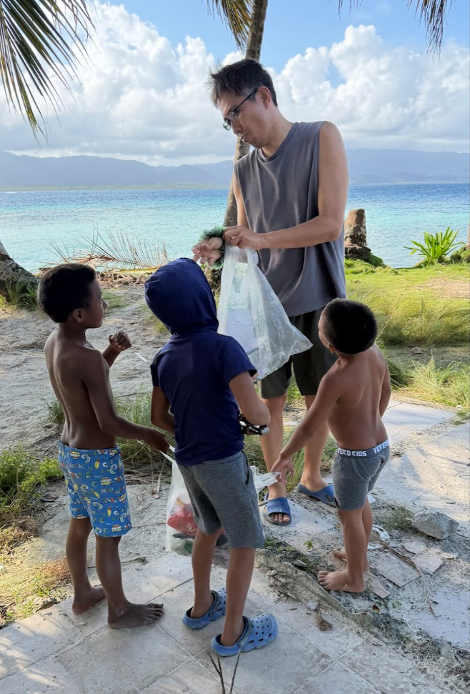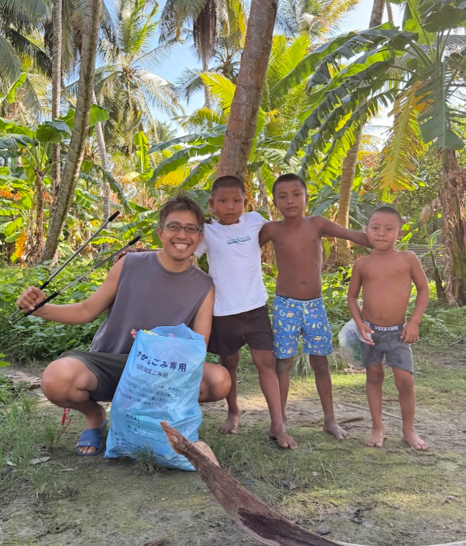 この日も島をゴミ拾いしていると、子どもたちが寄ってきます。ちょうど週末なので、学校がお休みで、たくさんの子どもたちが島にいました。私の隣がマツエル、その隣がギンミ。その隣がコスエル。