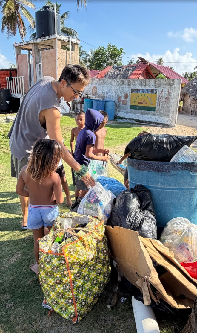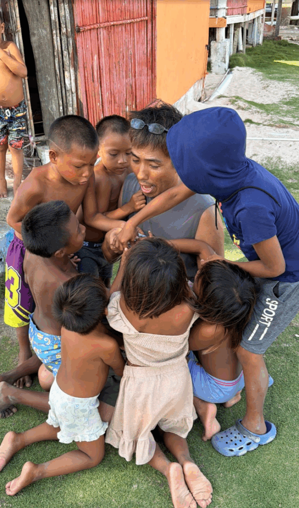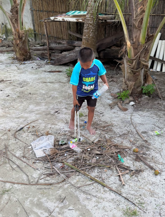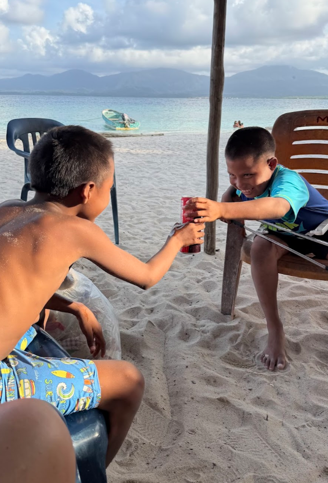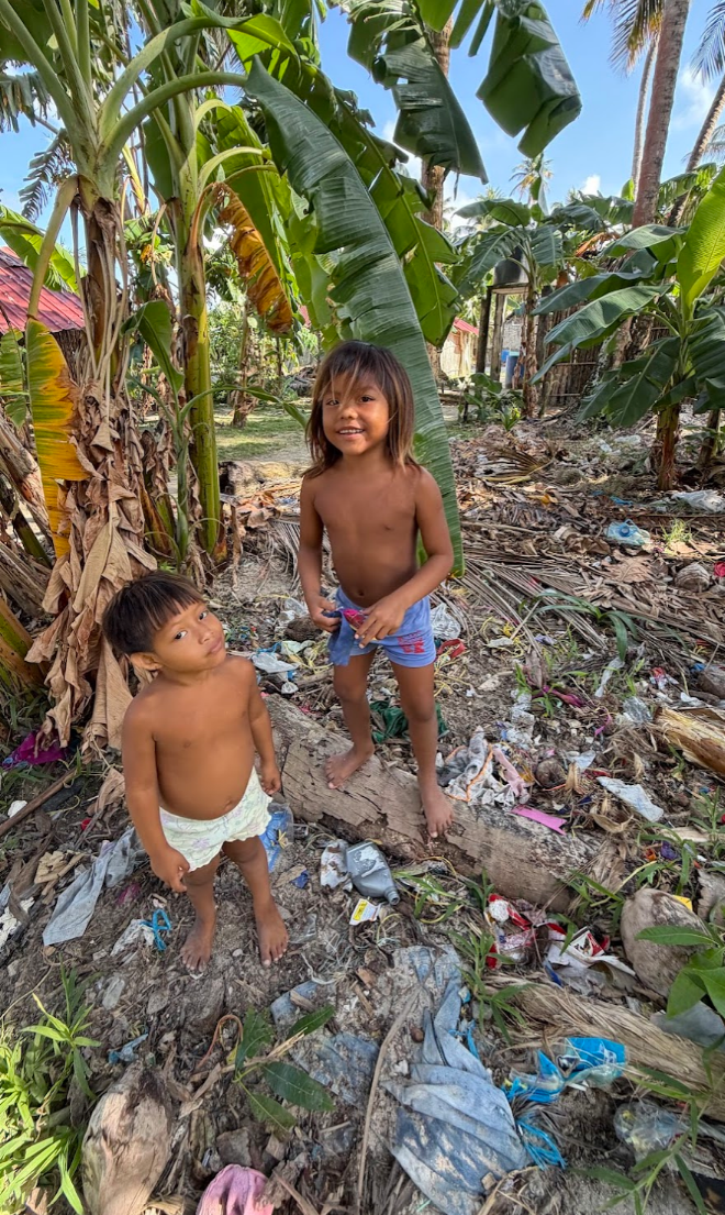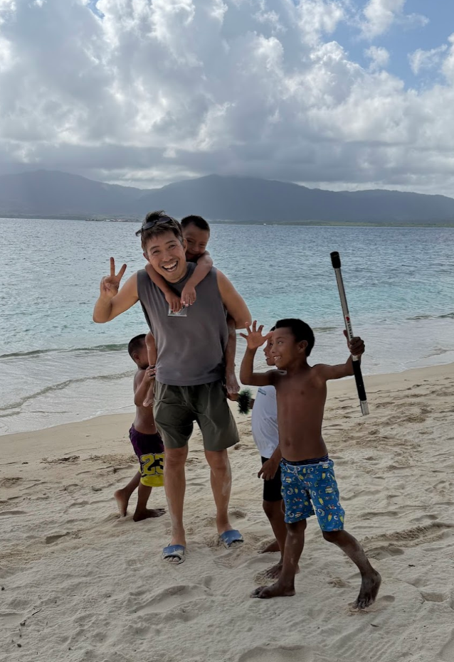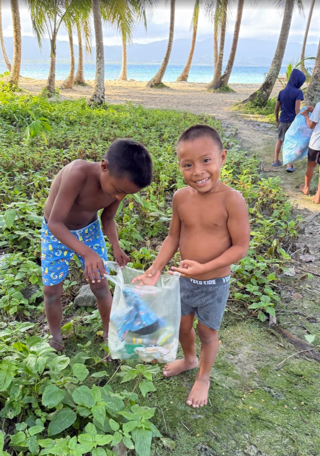 この日も島をゴミ拾いしていると、子どもたちが寄ってきます。ちょうど週末なので、学校がお休みで、たくさんの子どもたちが島にいました。私の隣がマツエル、その隣がギンミ。その隣がコスエル。