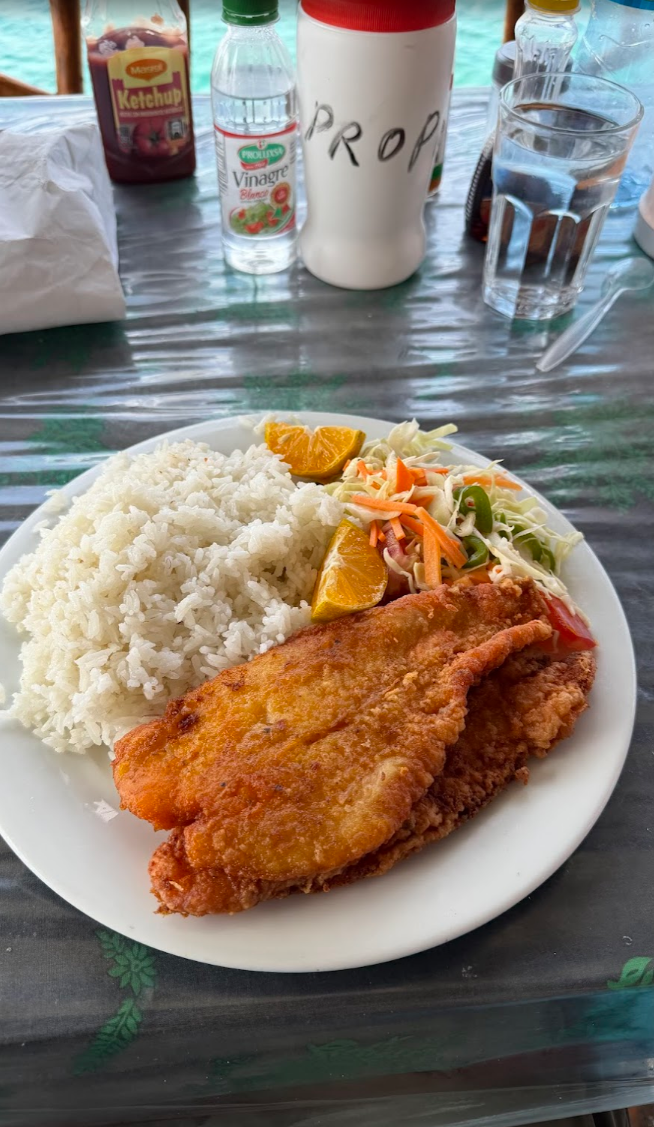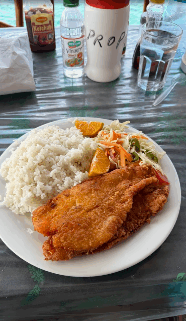 子どもたちと離れて、お昼ご飯♪ お魚のフライ♪ このお魚も近くの海で獲れたお魚です♪ 日本から持って来た、醤油やコチュジャンをかけると美味の三乗くらいになります♪