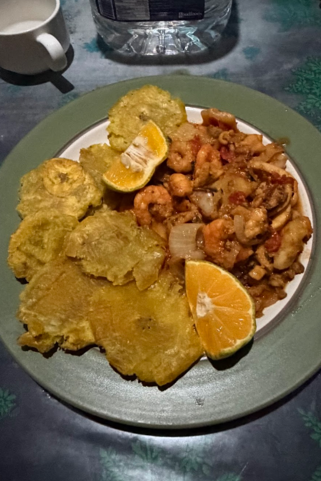 本日の夕食は海鮮炒めと、バナナのフライ♪