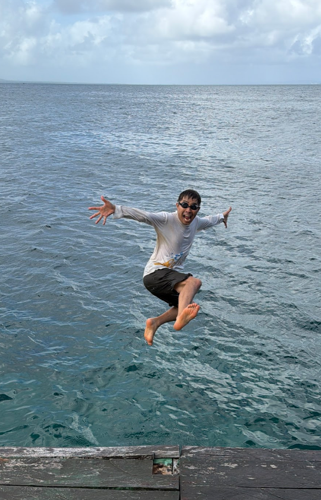 バンガローから海へ飛び込めるので、早速ダイブ♪ 宿の人に動画と写真をテイクツーで撮ってもらいました(笑)。